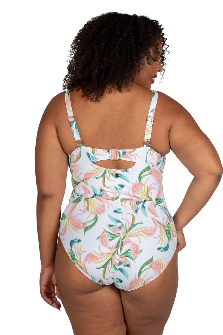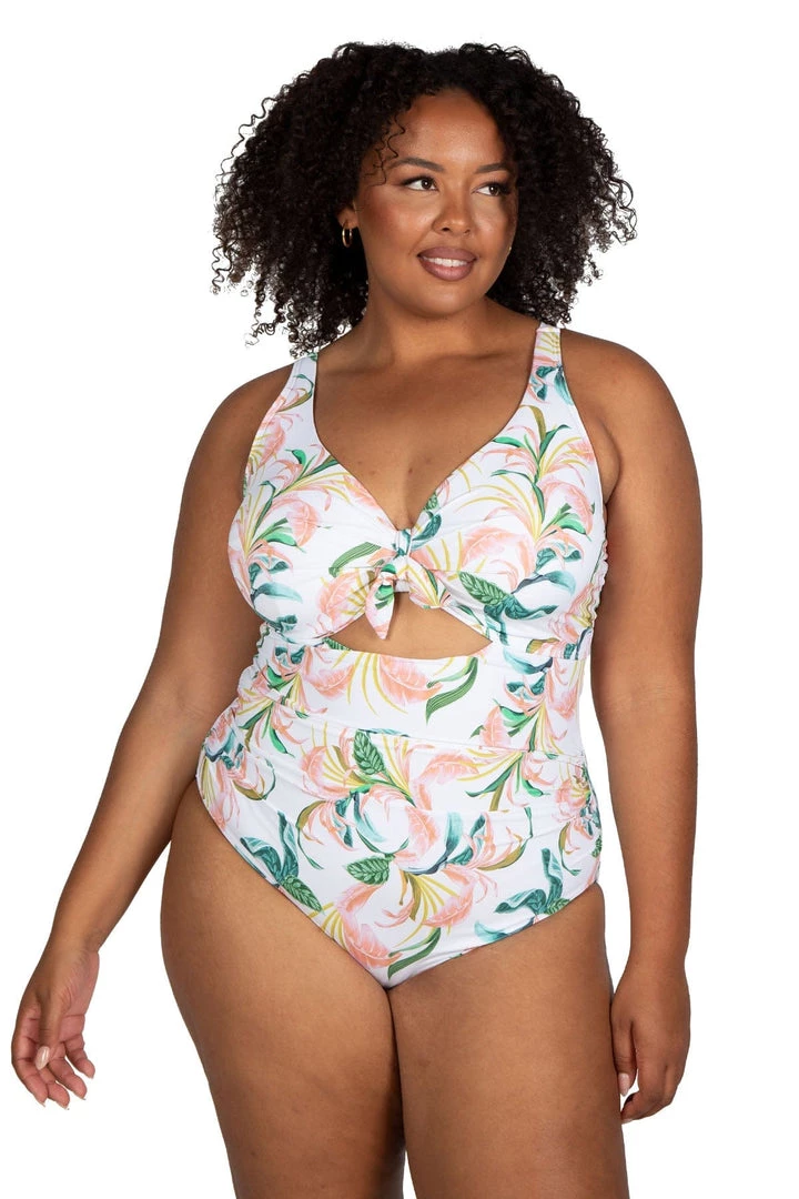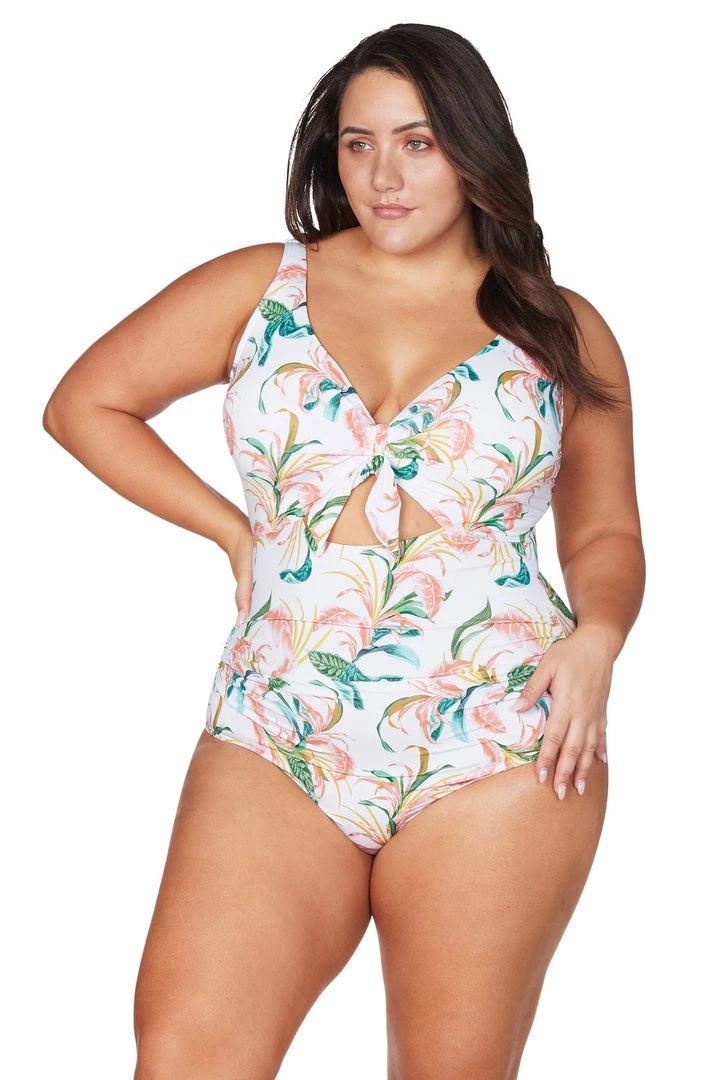 Artesands fits your curves. Make a curve statement in our Artesands Cezanne plus size one piece, the most flattering swimsuit shape EVER. Our Cezanne one piece has a mock knot tie at the front that covers a full internal cup support system. Our Cezanne shape is an underwire style with full foam cups that create great bust shape for a D cup, DD cup and E cup. But it is the peep hole on this style that creates the most amazing figure flattering illusion. The peephole creates a body enhancing hourglass shape and when paired back with our full body 360 degree powermesh and our front panel ruching this style is truly flattering. Cezanne has good moderate bottom coverage.