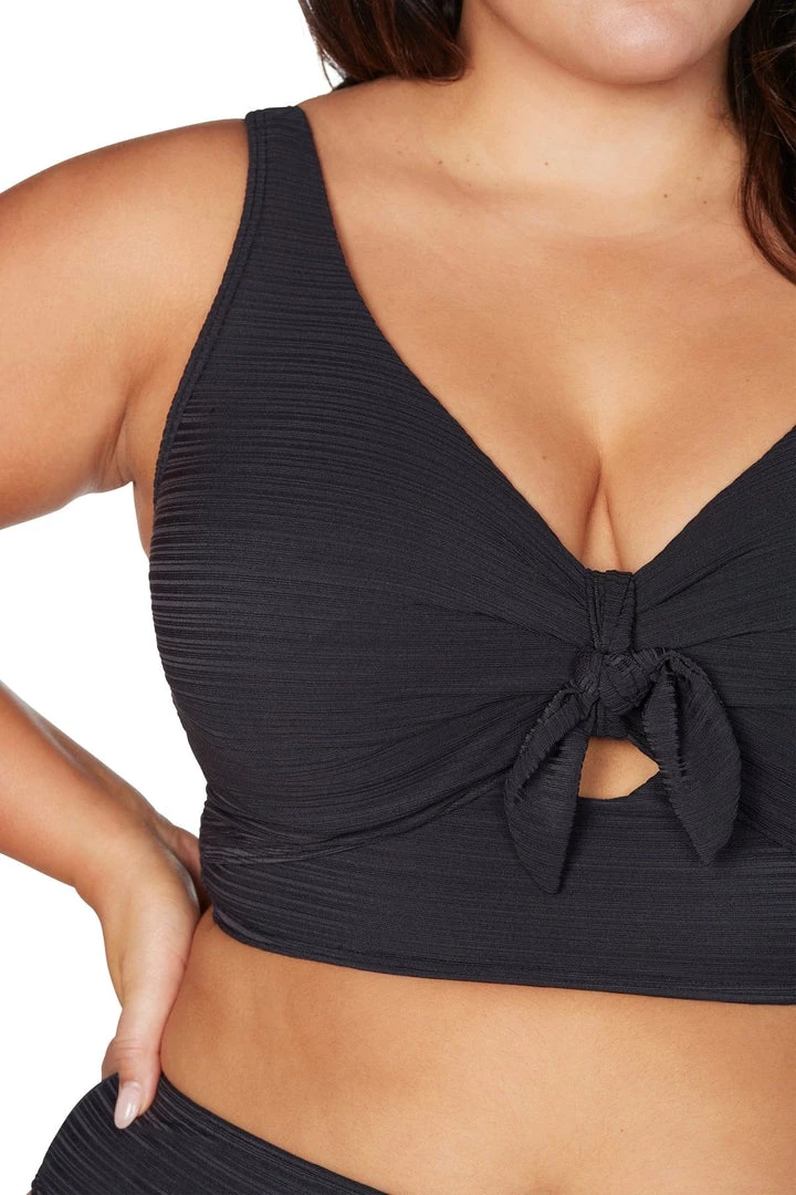 Artesands fits your curves. Make a curve statement in our Artesands Cezanne plus size midriff bikini top, the most flattering swimsuit shape EVER. Our Cezanne bikini top shape has a mock knot tie at the front that covers a full internal cup support system. Our Cezanne shape is an underwire style with full foam cups that create great bust shape for a D cup, DD cup to E cup. But it is the peep hole on this style that creates the most amazing figure flattering illusion. The peephole creates a body enhancing hourglass shape and when paired back with our curve fit and plus size swim pants.