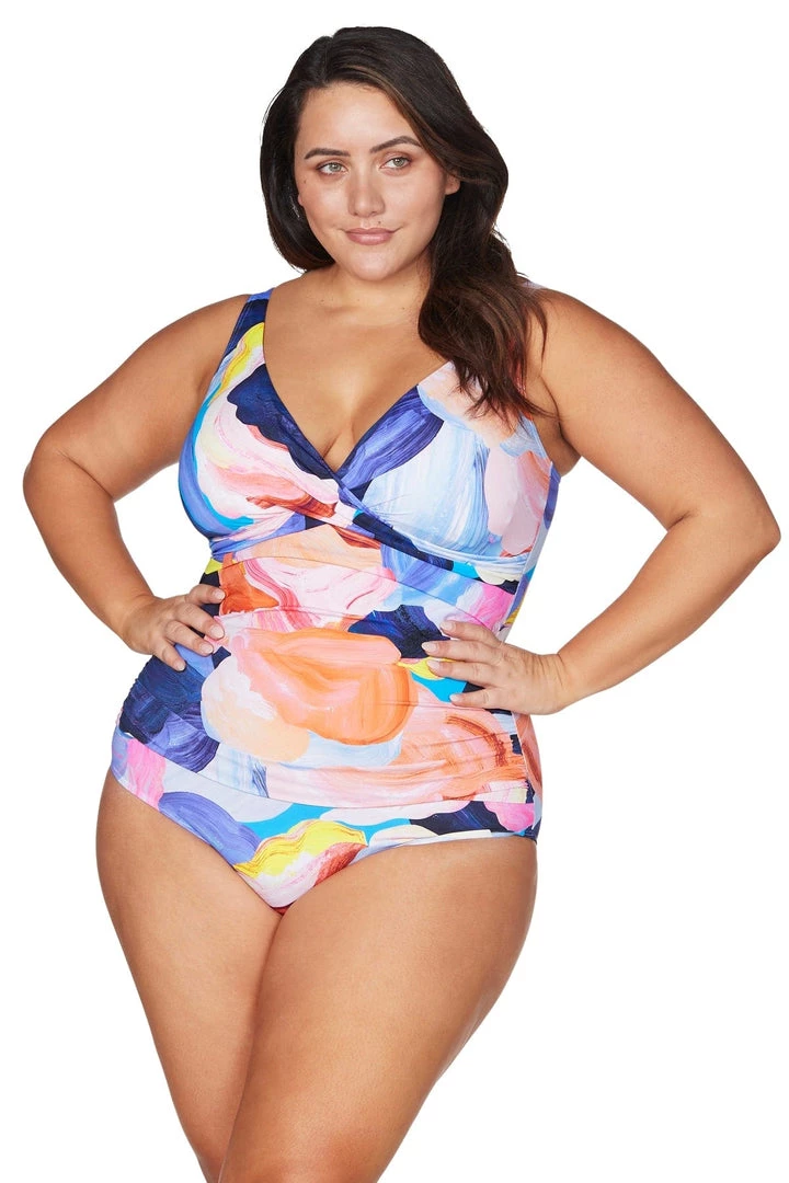 Artesands Fits Your Curves. Our Delacroix one piece shape is our wire free comfort and support style. Every woman needs a swimsuit that makes you feel good when you put it on and this is our curve fit and plus size shape Delacroix. This style has a cross front design with multifit cup support that fits a D cup , DD cup, E cup, F cup and a G cup. Delacroix has full body 360 degree powermesh and front body ruching for body sculpting confidence.
