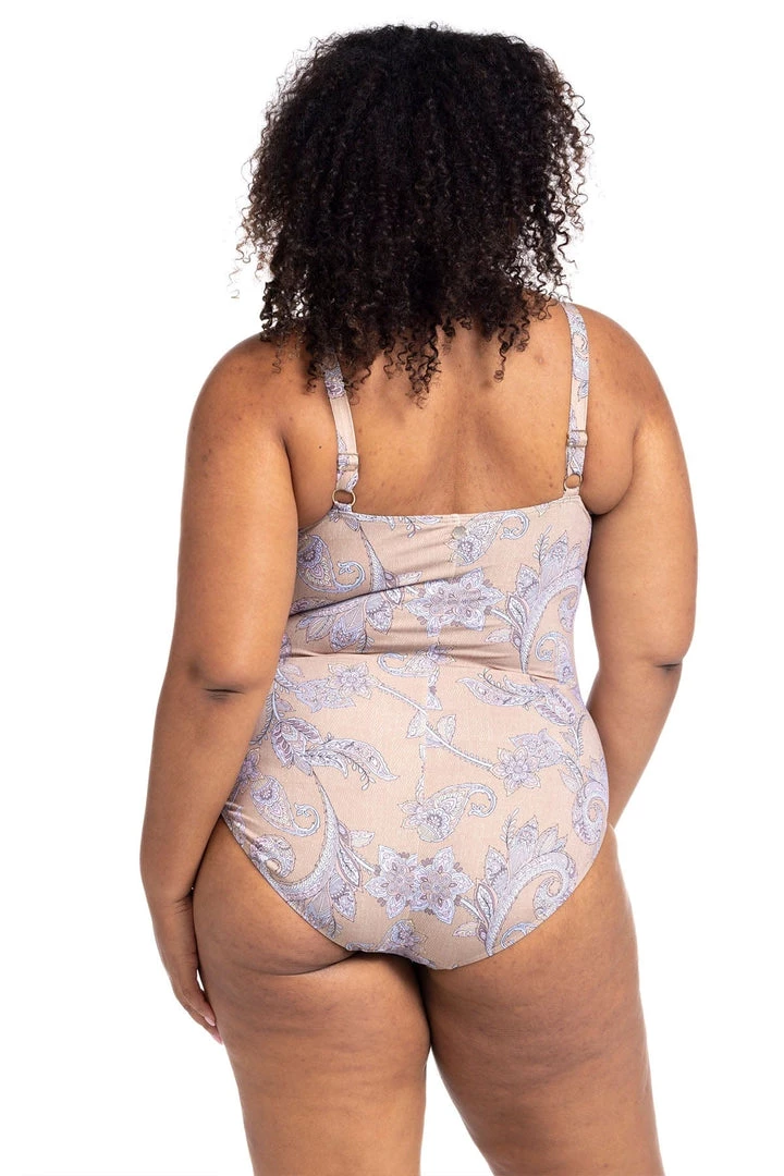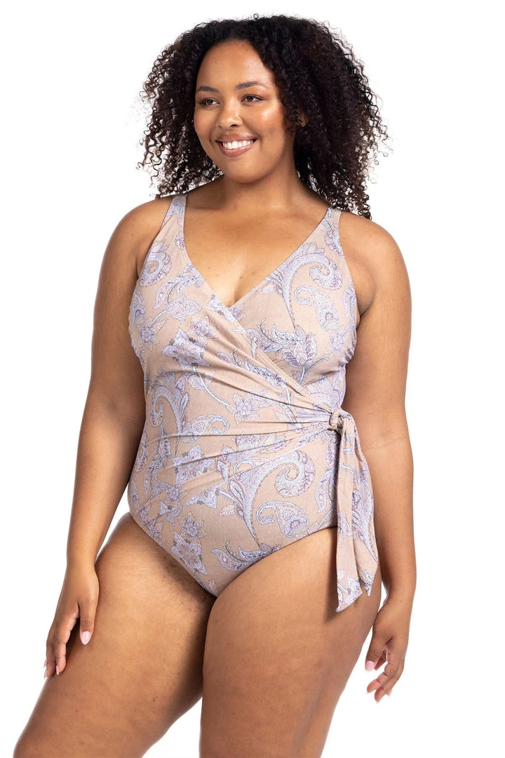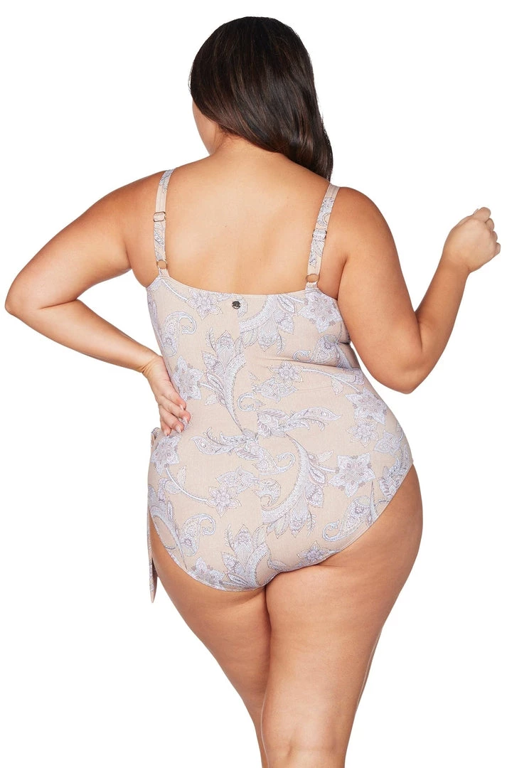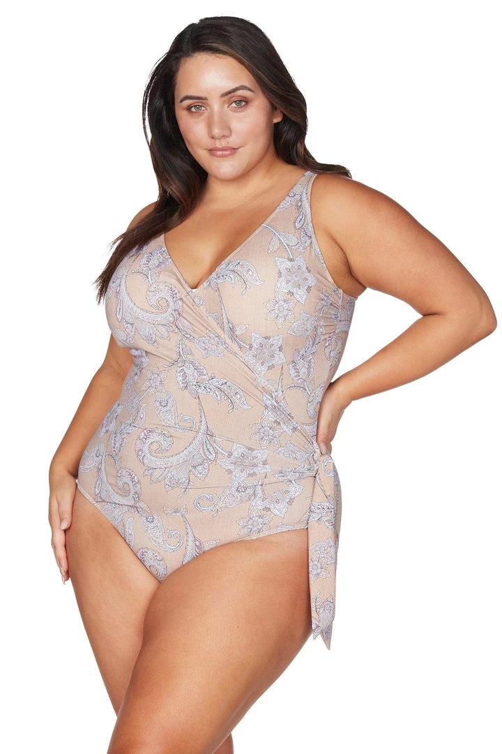 Artesands Fits Your Curves. Have curves? We have you covered in our Hayes Artesands curve fit and plus size one piece. This beautifully sculpted feminine wrap around style has a hidden shelf bra with internal support underwire to fit a D cup to DD cup, with removable soft foam cups and a front shelf bra. This one piece swimsuit has a faux cross over design with a side tie featuring the fashion look of the season. This swimsuit style allows all of the fit and support required for body sculpting and figure forming confidence for the curvy body. Our Hayes curve fit and plus size one piece has 360 degree powermesh lining and good moderate bottom coverage.