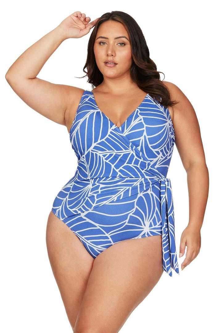 Artesands Fits Your Curves. Have curves? We have you covered in our Hayes Artesands curve fit and plus size one piece. This beautifully sculpted feminine wrap around style has a hidden shelf bra with internal support underwire to fit a D cup to DD cup, with removable soft foam cups and a front shelf bra. This one piece swimsuit has a faux cross over design with a side tie featuring the fashion look of the season. This swimsuit style allows all of the fit and support required for body sculpting and figure forming confidence for the curvy body. Our Hayes curve fit and plus size one piece has 360 degree powermesh lining and good moderate bottom coverage.