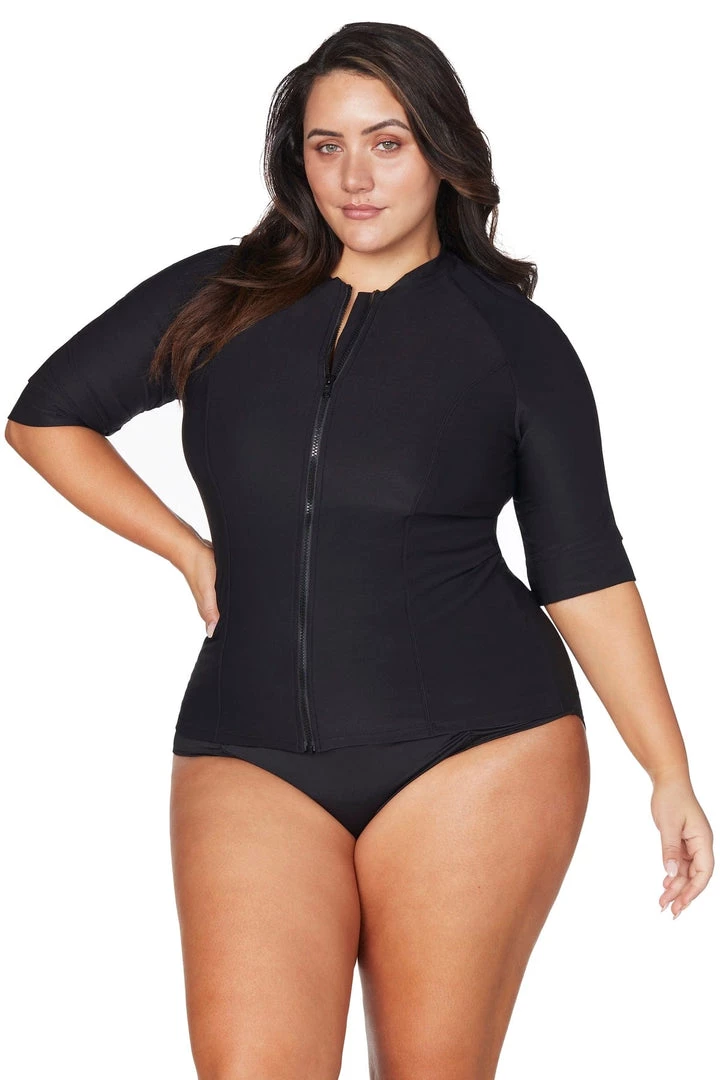 Artesands fits your curves. Be free to enjoy the summer in our sunsafe Seurat short sleeve rash top. This mid sleeve rash guard has an adjustable full zipper in the front. The length of the sleeve falls just above the elbow this allows for ease of arm movement with the most amount of sun protection. UPF 50+ to embrace the summer with maximum protection.