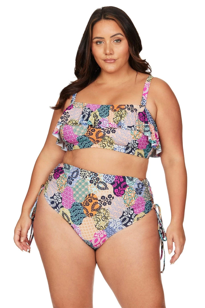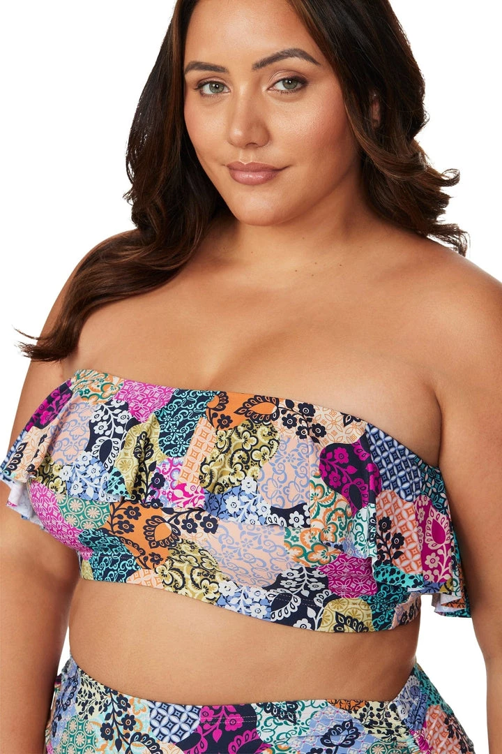 Artesands fits your curves. Be charmed in our Artesands Vermeer plus size bikini top, our most feminine swimsuit silhouette that is designed to flatter. Our Vermeer bikini top is a flounce style pull on bandeau bikini with detachable straps. Our Vermeer shape is a multifit cup style with removable foam cups that create great bust shape. This style is best fitted for a bust size range of B cup, C cup, D cup and DD cup. This style is a bandeau bikini top with removable adjustable straps. This full support bandeau will give you all the confidence you need to get a tan without strap lines.