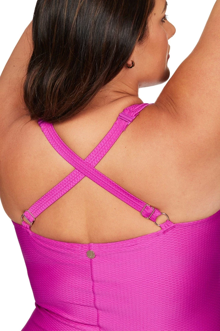 - Double Front Ruching – Ruching is the gathering of extra fabric in the outer fabrication of our swimwear. This ruching effect helps create a disguising effect across our tummy and mid section. This swimsuit has ruching on the body and side panels for extra body sculpting.