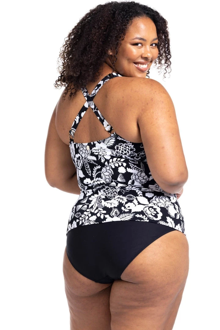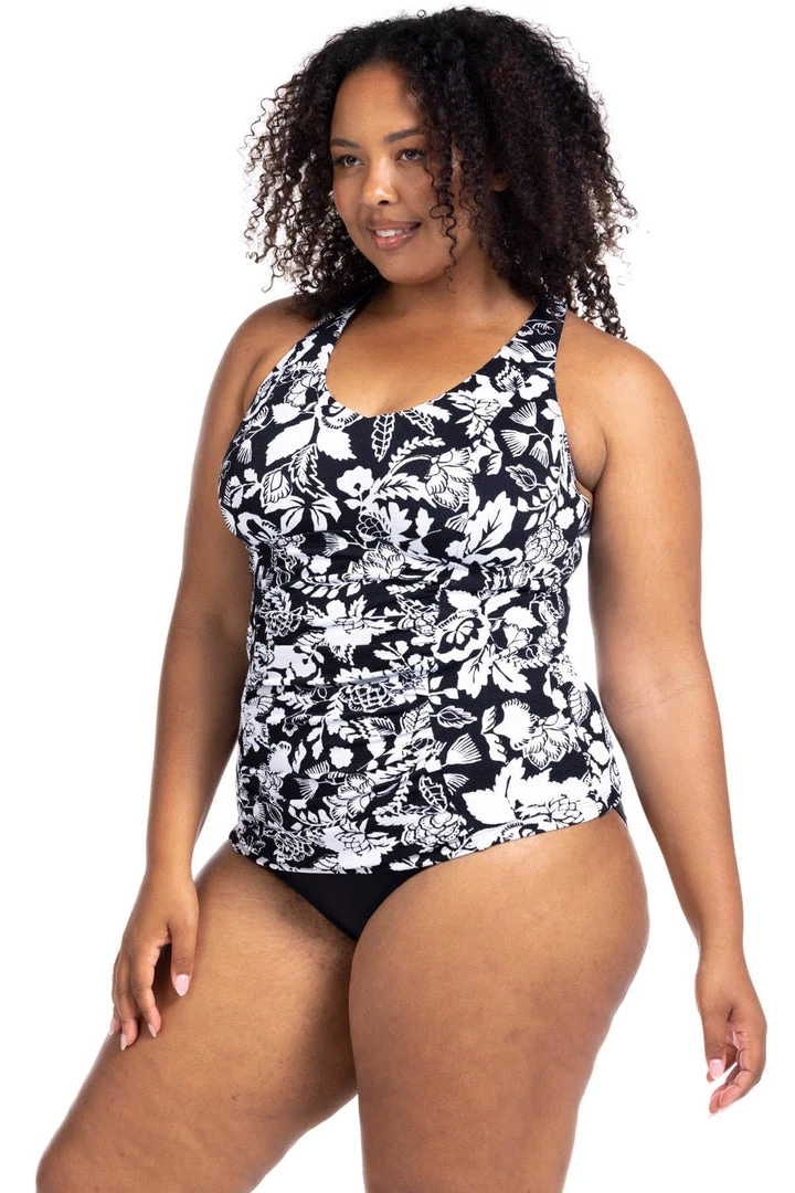 - Long line tankini top – Our curve fit and plus size tankini top is designed to be fitted to the body. This features a long line length to avoid any riding up while swimming or lounging around the pool. Designed to look like you are wearing a one piece when paired back with the matching swim pant.
