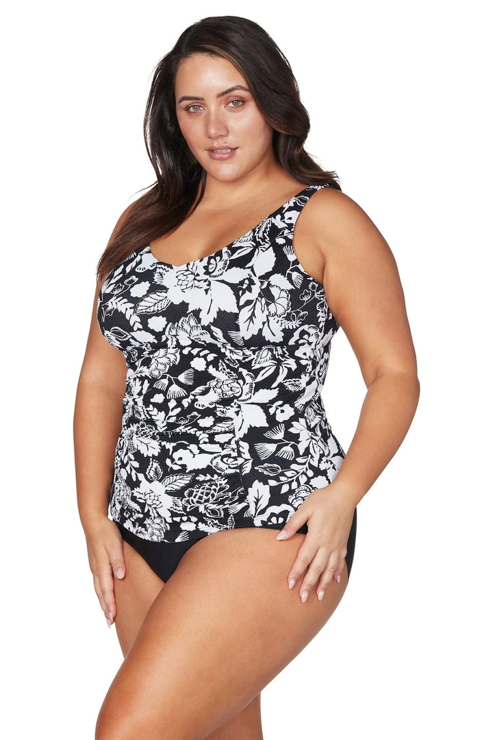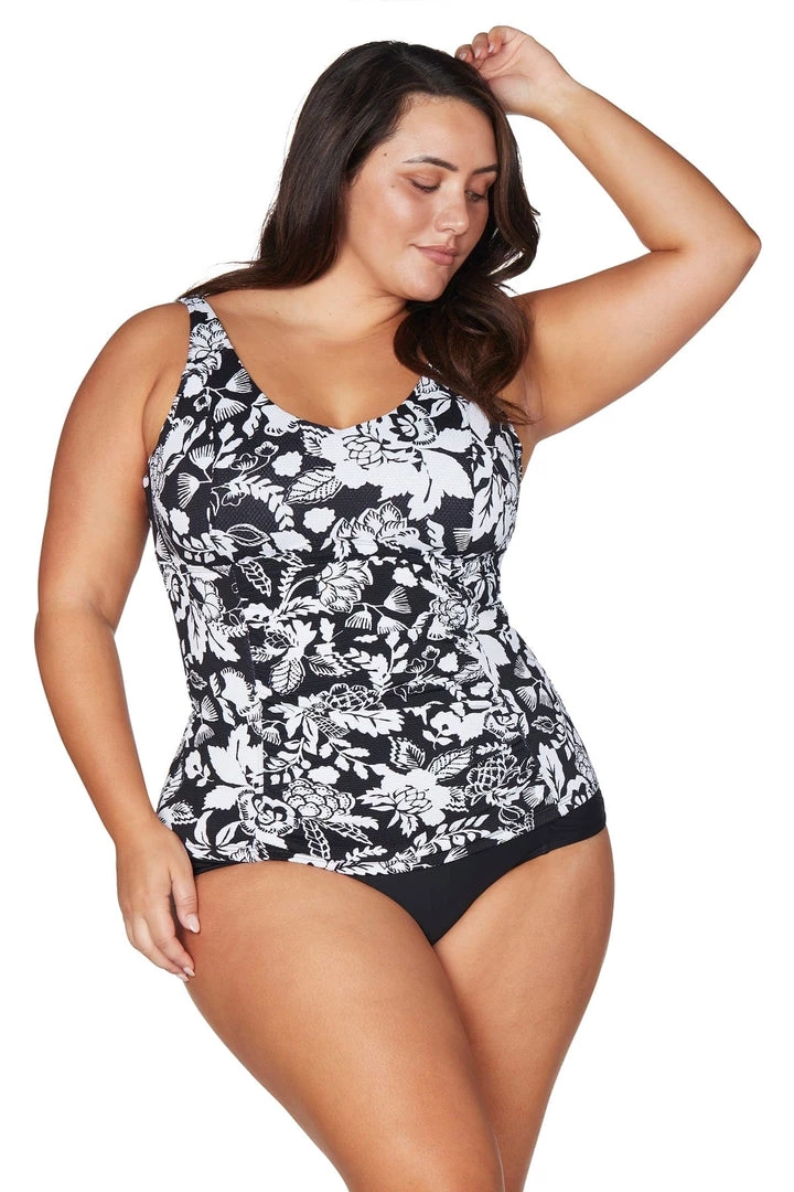 Artesands Fits Your Curves. Raphael is our full support one piece style with all the bells and whistles. This curve fit and plus size one piece swimsuit has underwire support to fit a E cup to F cup. This swimsuit has an internal bra fitting, and full body 360 degree powermesh for body sculpting confidence. Our curve fit and plus size tankini tops are a long line to avoid the fabric riding up when you’re in the water.